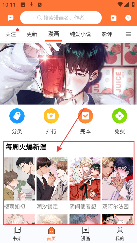 1、在软件首页漫画板块,点击【每周火爆新漫】中的【樱雨如初】漫画,可进入漫画详情页,了解漫画信息啦。