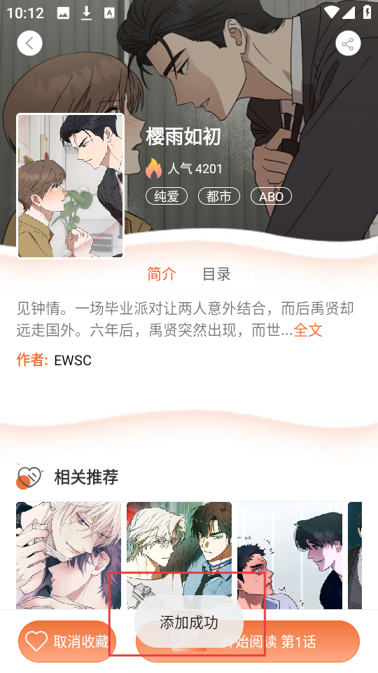 3、点击收藏后,会弹出【添加成功】提示,说明漫画已成功加入收藏,可在收藏列表中找到啦。