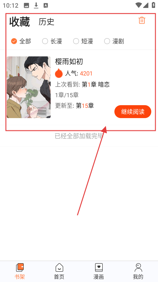 4、在收藏页面,可看到已收藏的漫画【樱雨如初】,点击【继续阅读】,可继续阅读该漫画哦。