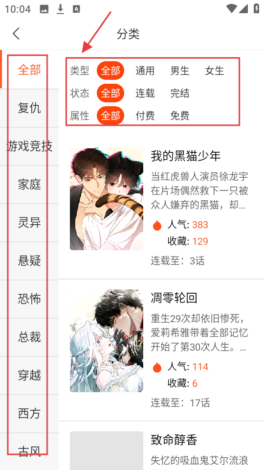 2、在【分类】页面,能选类型、状态、属性来筛选漫画,精准找漫超方便哦。
