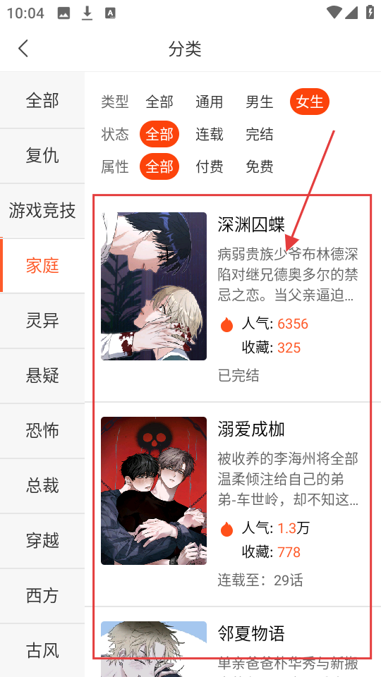 3、选【女生】类型,再挑个感兴趣的分类,比如【家庭】,就能看到对应的漫画啦。