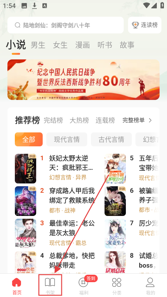1、在小说首页,推荐榜有不少小说,选好后,点击底部【书架】,就能去书架查看或管理小说啦。