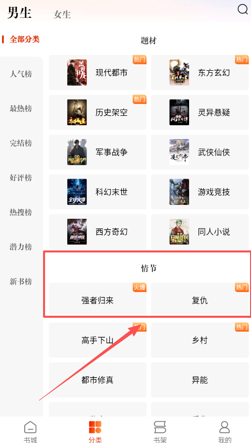 2、书城页面是找书主阵地,可通过题材分类或情节标签筛选想看的类型,各种榜单也能帮你发现热门佳作。