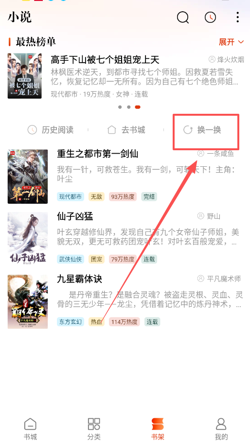 4、软件底部四个功能图标很实用,书架管理你的收藏,分类页聚合了推荐书单和换一换功能,让你轻松找到下一本好书。