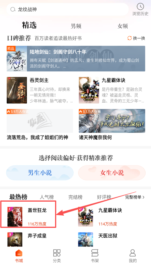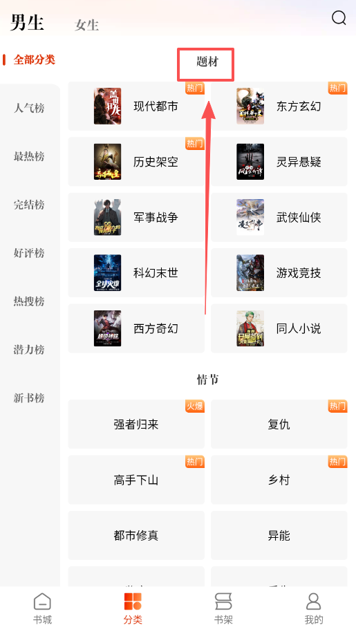 2、想找更多书籍可进入书城,这里可以切换男生女生频道,还能按题材类型或情节标签进行筛选,热门榜、完结榜等榜单也值得参考。