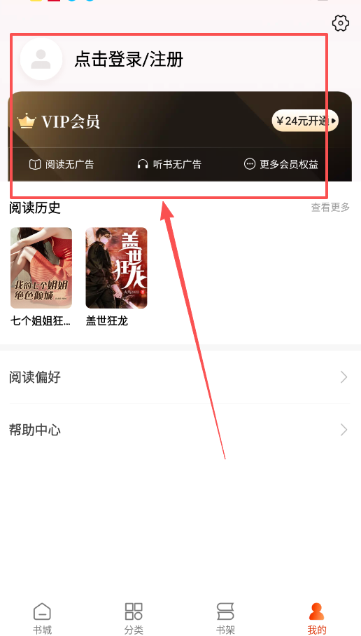 3、我的页面需要登录使用,登录后能查看阅读历史找回之前读的书,也能设置偏好让推荐更精准,同时了解VIP会员的无广告权益。