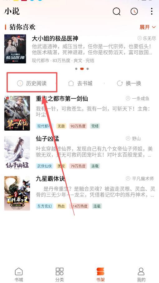 4、日常操作看底部导航栏,书架保存你在追的所有书,分类页则提供历史阅读和热门书单等智能推荐,方便你持续发现新作品。