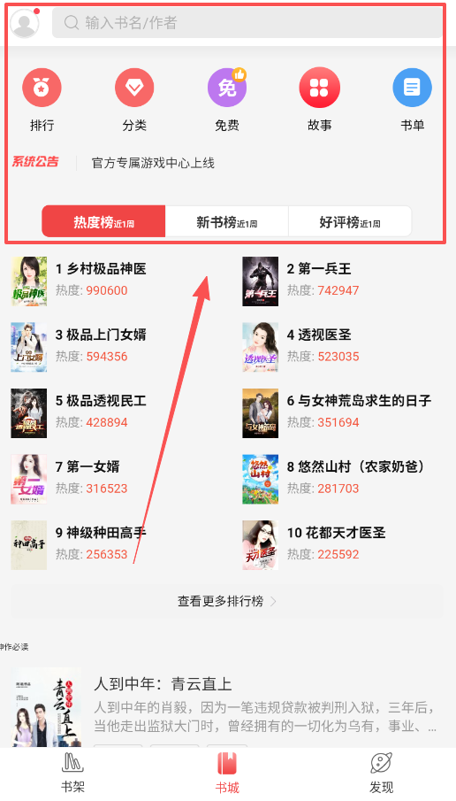 1、首先进入书城页面,这里资源丰富,可以通过分类排行或免费专区来初步筛选你喜欢的书籍类型。