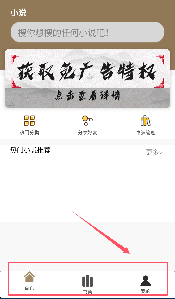 1、打开软件后先熟悉底部三大导航模块,首页是内容发现中心,书架管理个人收藏,我的页面处理账户设置。