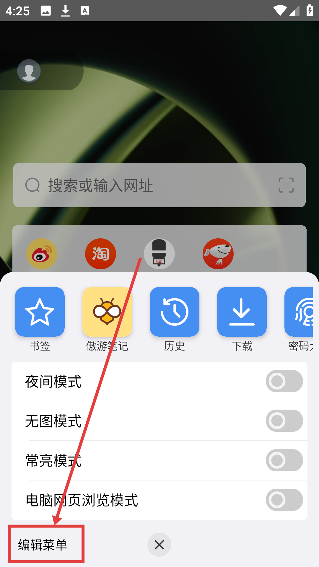 4、编辑完成后返回,就能看到精简后的菜单入口,比如只显示【书签】【历史】【设置】啦。