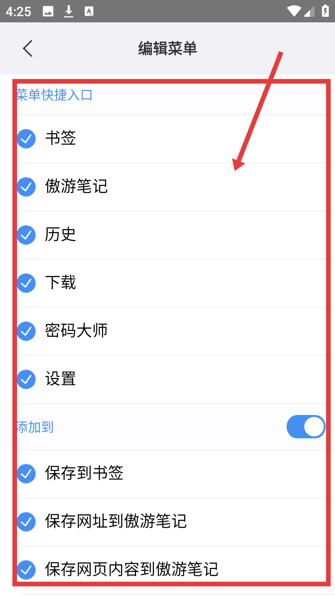 3、在编辑菜单界面勾选想保留的快捷入口,比如【书签】【历史】等,完成菜单定制哦。