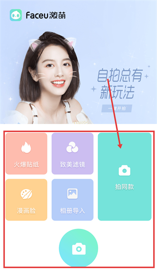 1、进入Faceu激萌主界面后,点击【拍同款】按钮,就能进入同款特效的选择页面啦。