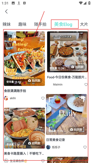 3、切换到【美食Elog】分类,可找到适合美食拍摄的特效模板,让美食内容更生动好看哦。