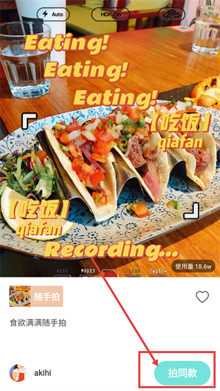 4、选中喜欢的美食特效后,点击【拍同款】按钮,就能使用该特效拍摄对应的美食内容啦。