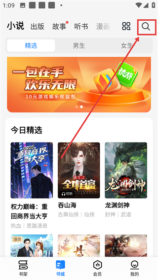 1、在书城页,点右上角的搜索图标,可进入搜索界面,输入想找的书籍关键词哦。