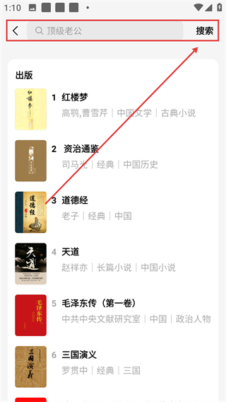 2、进入搜索页后,在搜索框填关键词,点【搜索】就能查到对应的书籍列表啦。