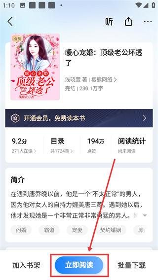 4、在书籍详情页,点【立即阅读】按钮,就能进入阅读界面,开始浏览这本书的内容哦。