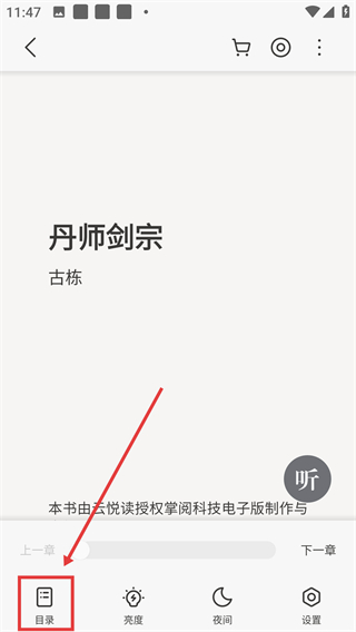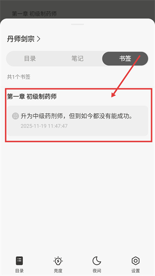 1、在【丹师剑宗】阅读界面点击底部【目录】,展开目录面板,可查看书签等内容哦。