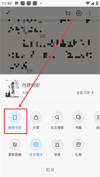 4、在功能菜单里点击【删除书签】,即可移除当前章节对应的书签内容啦。