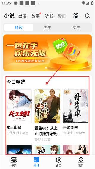 1、在书城的今日精选区域选中心仪小说,比如【重生60:从上山打猎开始致富】,点击进入详情页哦。