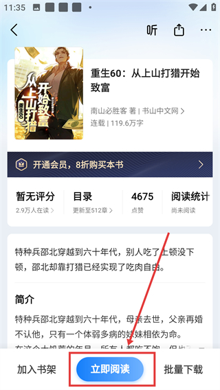 2、在小说详情页点击【立即阅读】,进入阅读界面,就能开始看这本小说的内容啦。