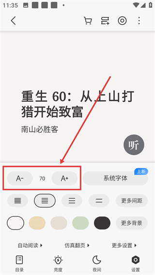 4、在设置面板里用【A-】【A+】按钮调整字体大小,就能改成自己舒服的阅读字体啦。