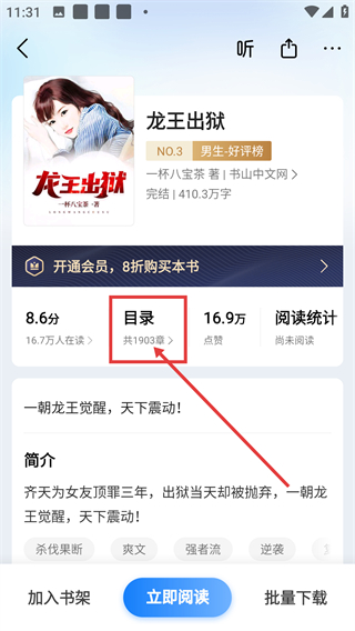 2、进入小说详情页后,点击【目录】选项,可展开章节列表,方便选择想阅读的具体章节哦。