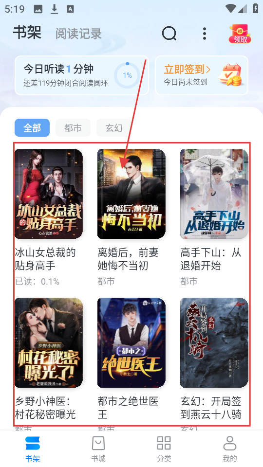 1、在书架页面,有好多小说,像【离婚后-前妻她悔不当初】这类,想阅读的话点击小说封面就能进入详情页啦。
