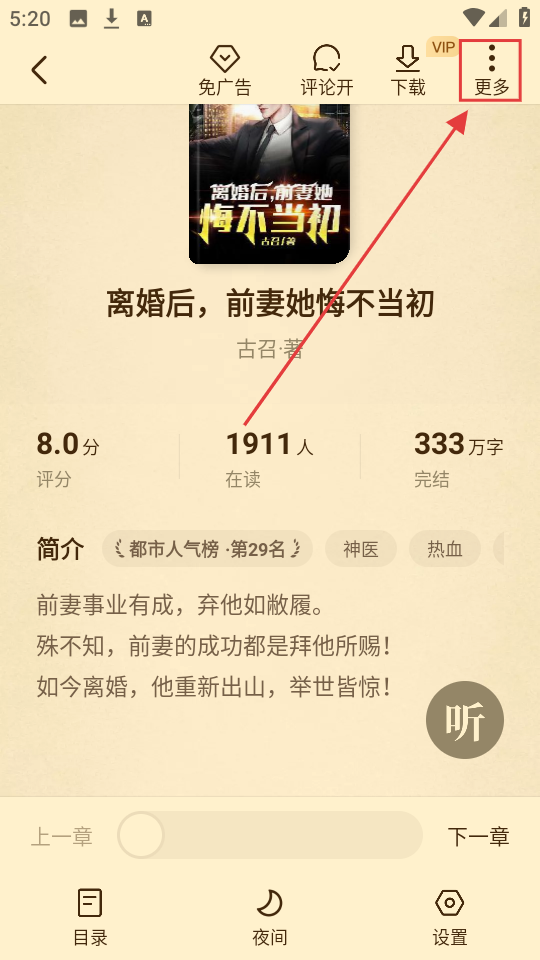 2、进入小说详情页后,看到右上角的【更多】按钮,点击它能展开更多功能选项,可进行多样操作呢。