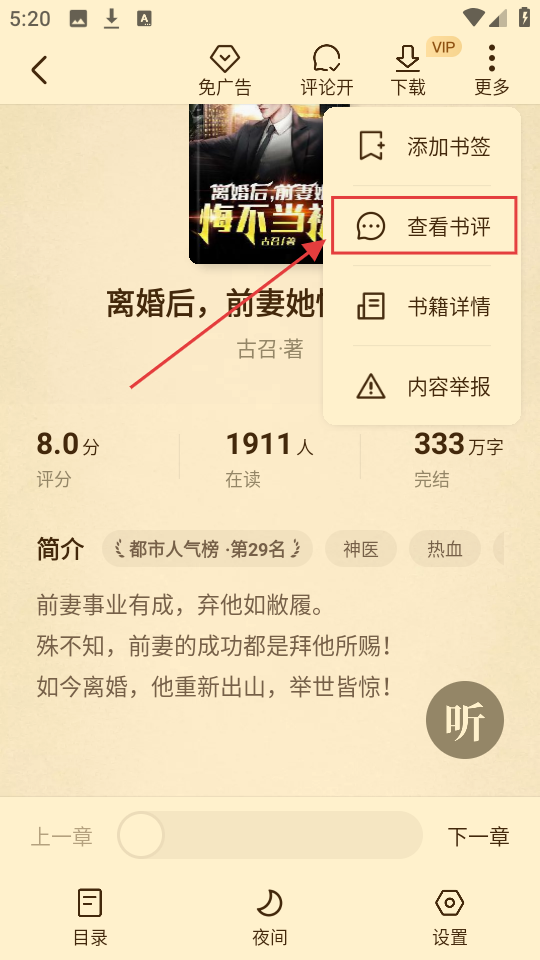 3、展开更多功能选项后,若想了解其他读者的看法,点击【查看书评】选项,就能看到大家的评论啦。