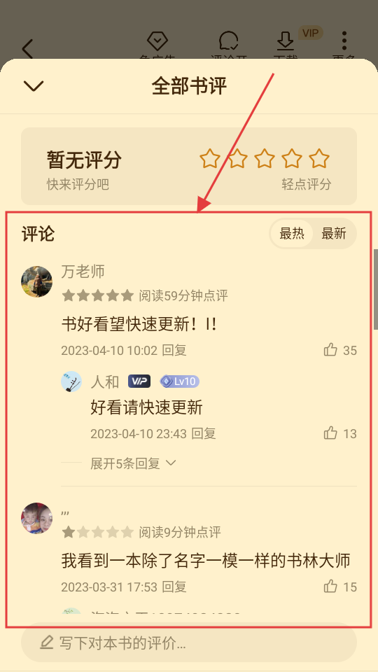4、进入书评页面,能看到其他读者的评分和评论,像“书好看望快速更新!!”这类,方便参考书籍口碑哟。