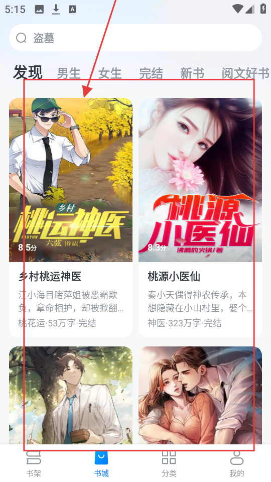 1、在书城发现页面,有好多小说推荐呀,像【乡村桃运神医】【桃源小医仙】等,挑选喜欢的小说点击进入详情页就行啦。