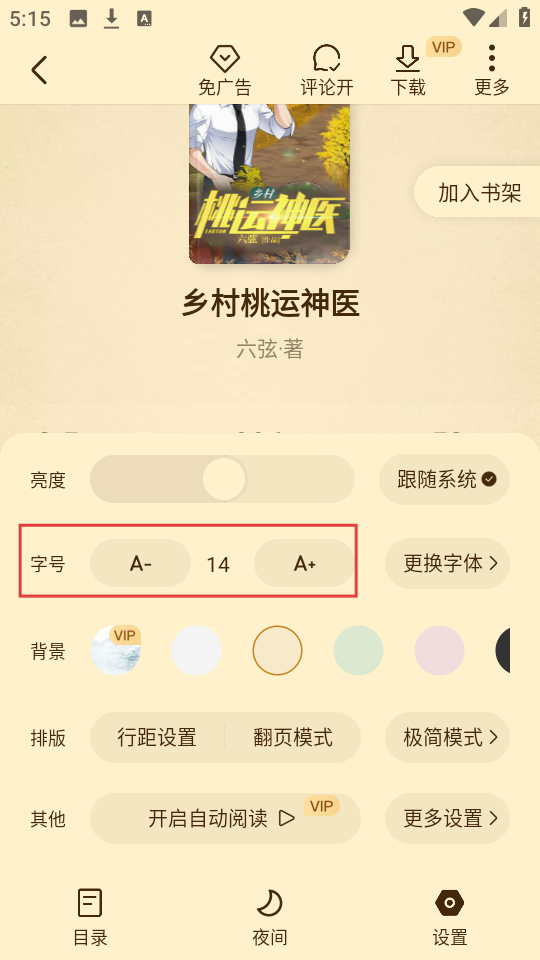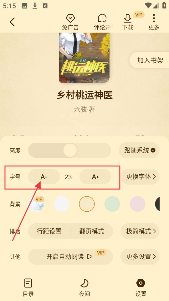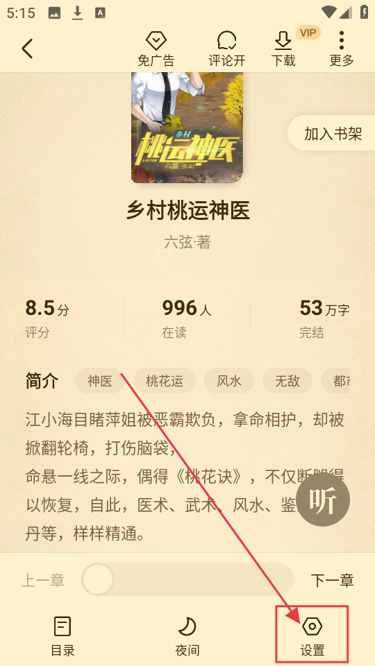 2、进入小说详情页后,若想调整阅读设置,点击页面底部的【设置】按钮,就能打开设置选项啦。