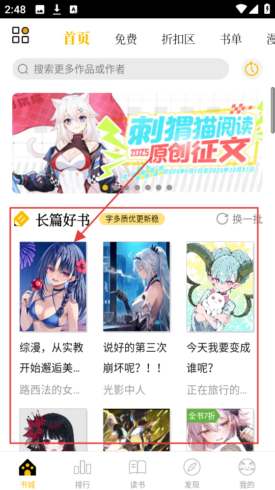 1、书城首页的【长篇好书】板块有不少优质小说,选一本感兴趣的点进去吧。