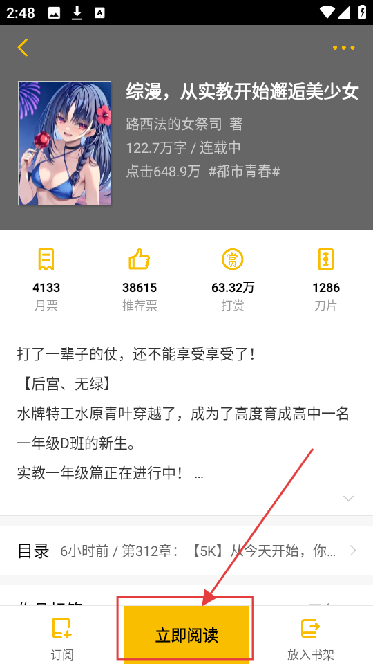 2、进入小说详情页后,点击【立即阅读】,就能开始阅读精彩内容,超方便哦。
