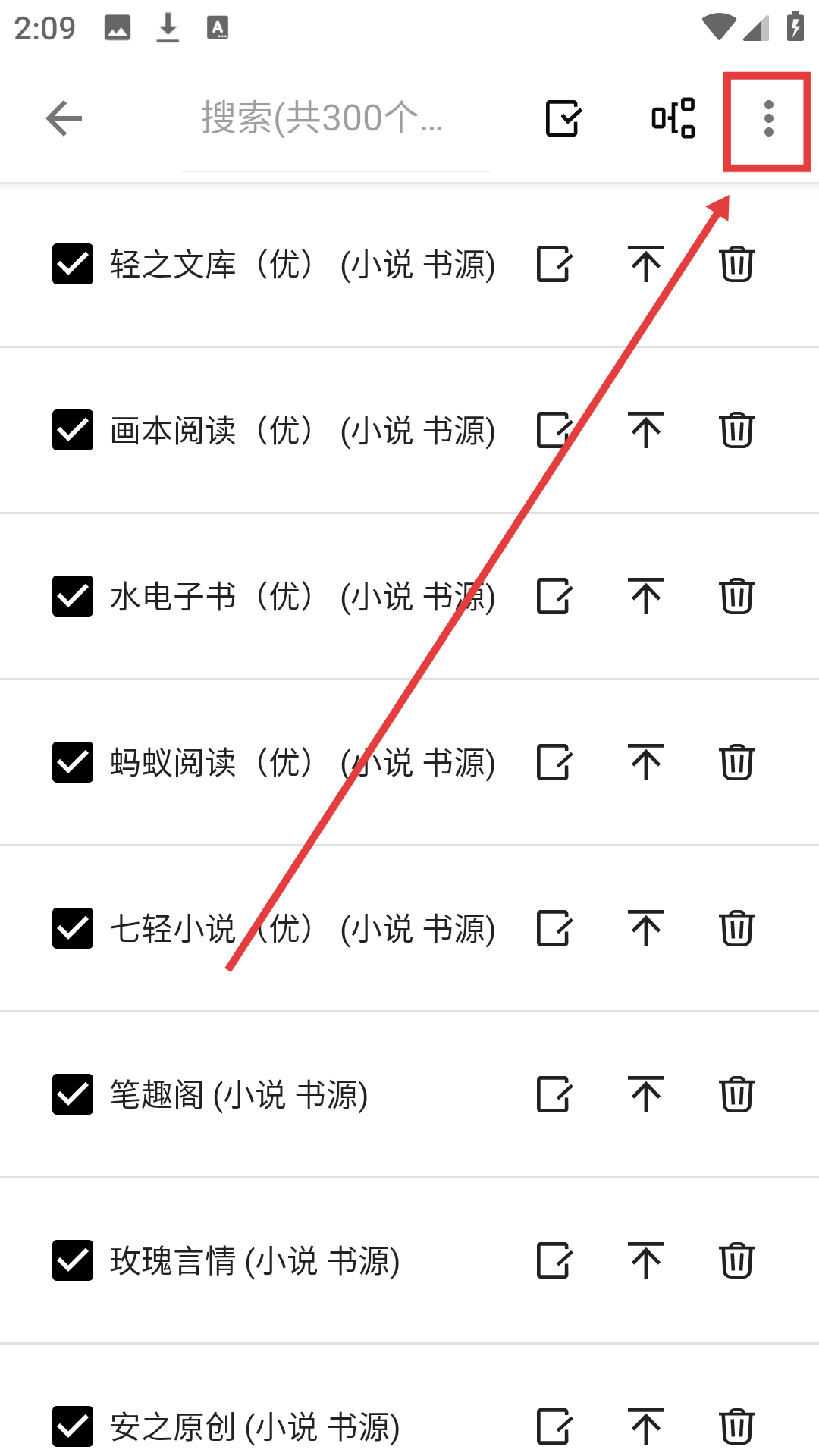 2、在书源管理页面点击右上角三个点按钮,展开功能菜单啦。