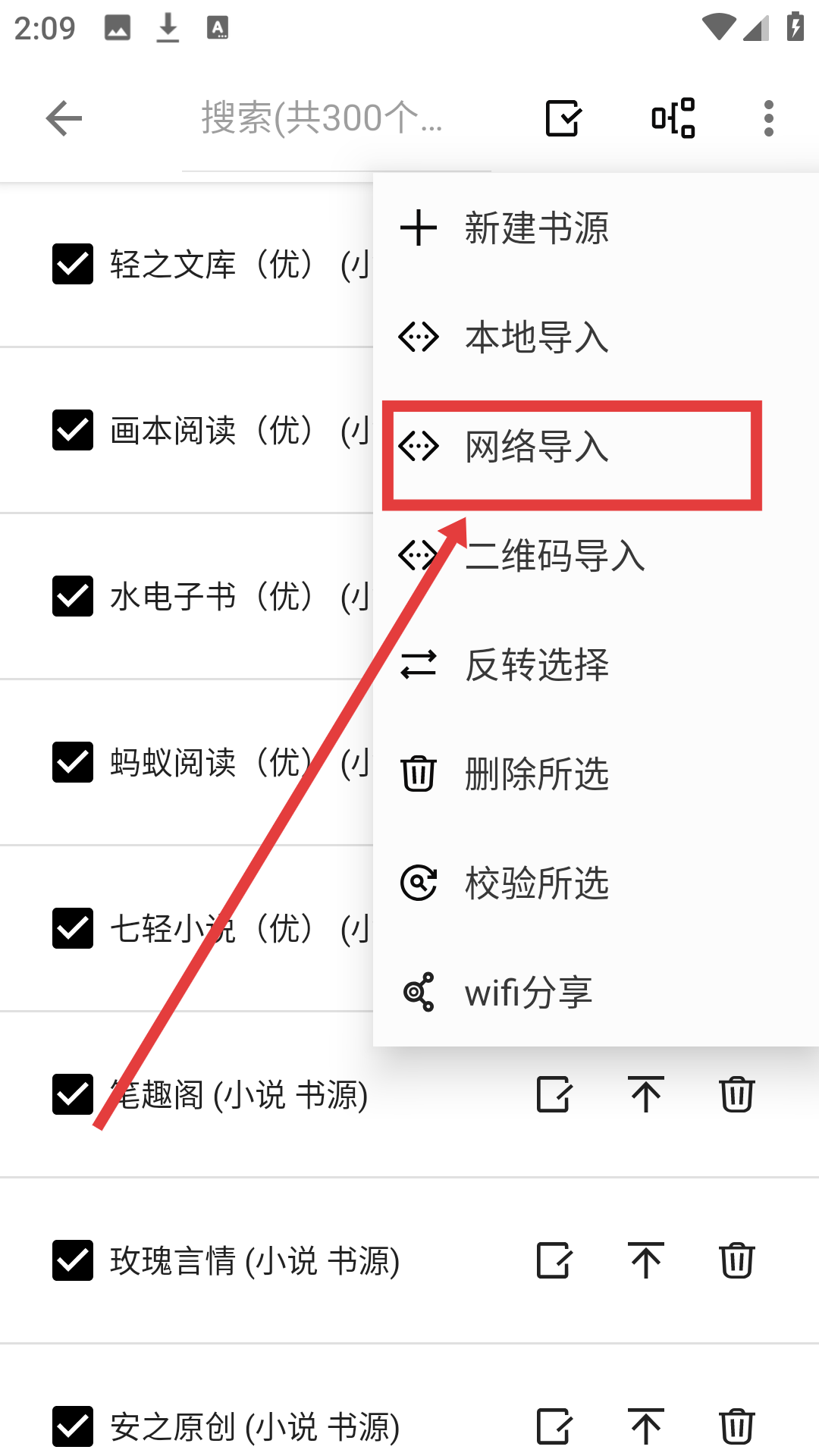 3、在功能菜单中点击【网络导入】选项,可进入网络导入书源的页面哦。