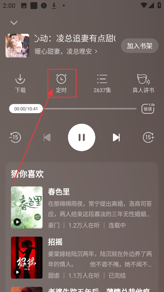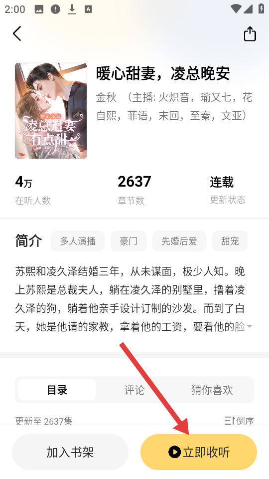 1、打开APP,在书城切换到【听书】板块,挑选今日力荐的小说,比如【暖心甜妻,凌总晚安】啦。