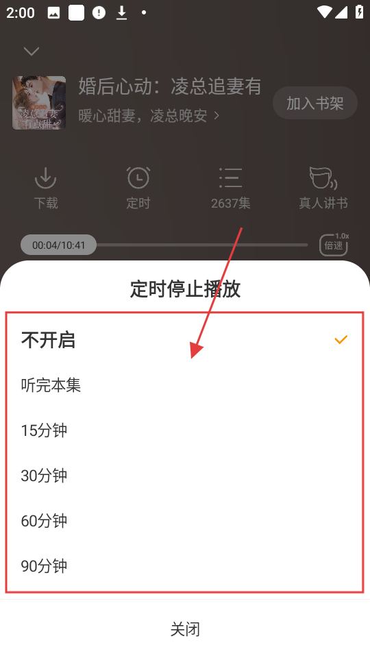 4、在定时停止播放列表中,可选择听完本集、15分钟、30分钟等时长,设置后到时间就会自动停止播放啦。