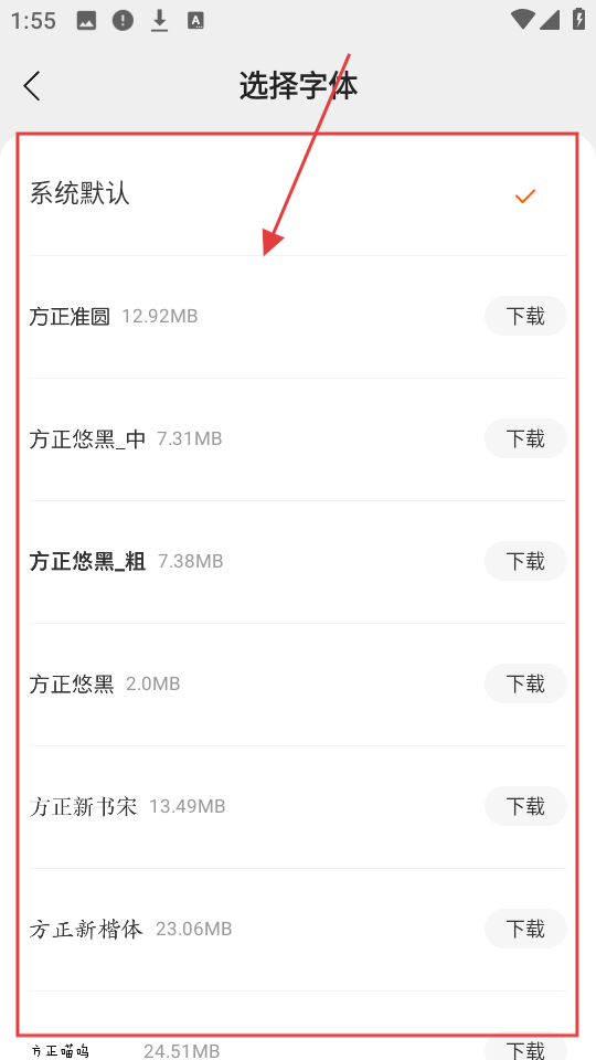 4、到选择字体页面,有多种字体可选,比如【方正准圆】,喜欢就下载使用。