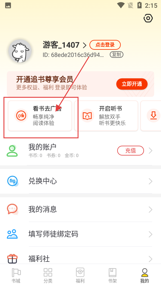 2、在个人中心,若想开启纯净阅读,点击“看书去广告”入口哦。