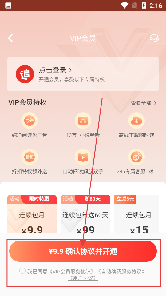 3、在会员开通页面,选择¥9.9连续包月套餐,勾选相关协议后,点击【确认协议并开通】啦。