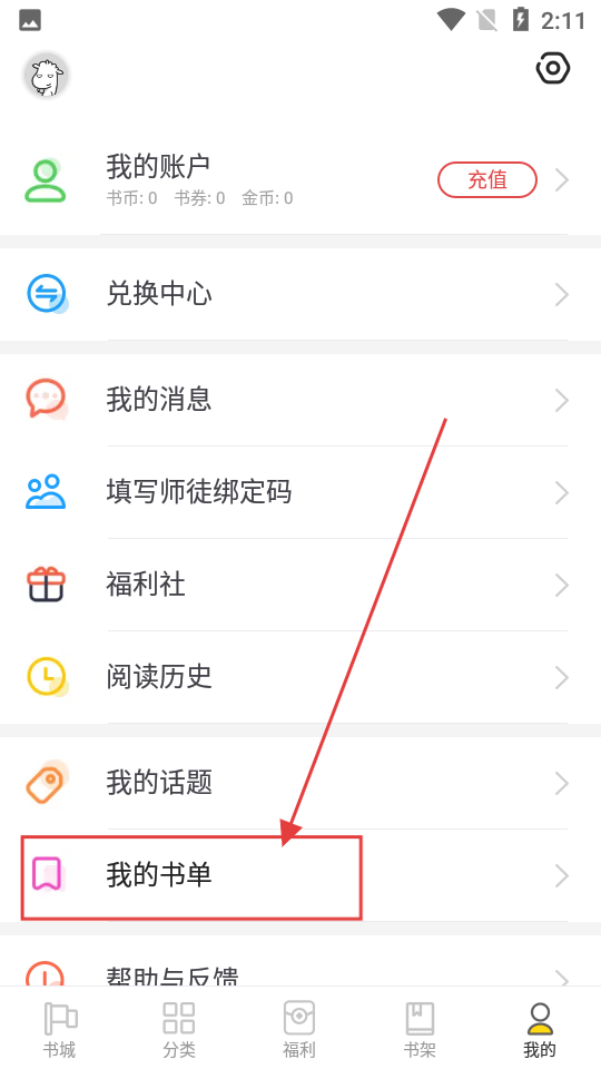 2、进入【我的】页面后,里面有好多功能选项,想管理书单就点击【我的书单】选项。