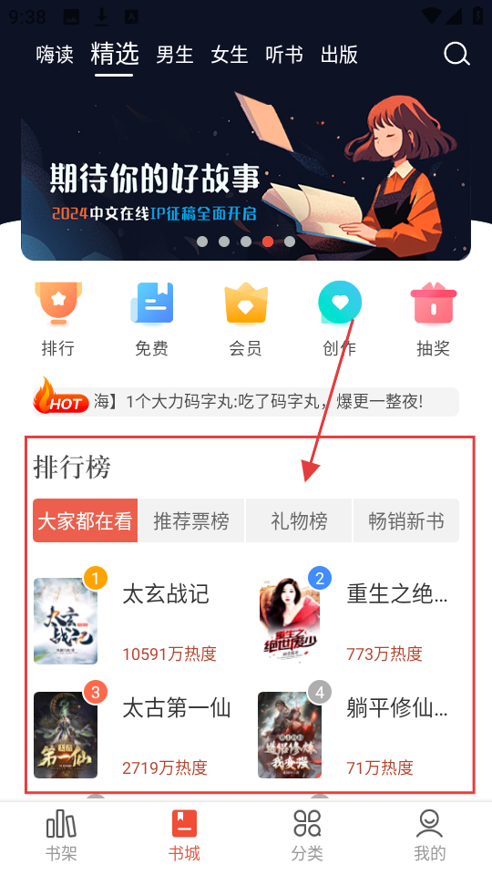 1、在书城精选页面,排行榜有热门小说如【太古第一仙】,点击它可进入小说详情页,了解小说信息哦。