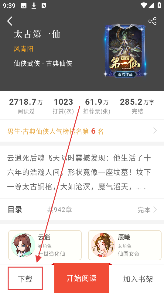 2、进入小说详情页后,点击【下载】按钮,可进入章节选择页面,选择要下载的章节啦。