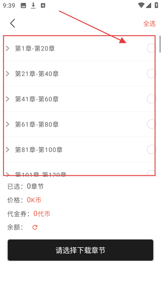 3、在章节选择页面,可看到各章节区间,如【第1章-第20章】等,选择需要下载的章节哦。