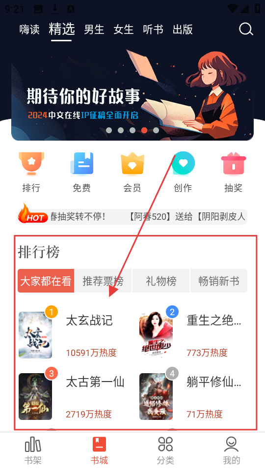 1、在书城精选页面,排行榜有热门小说如【太玄战记】,点击它可进入小说详情页。