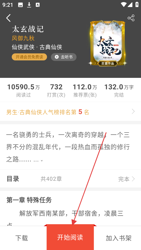 2、进入小说详情页后,点击【开始阅读】按钮,可进入小说阅读页面,开始阅读啦。