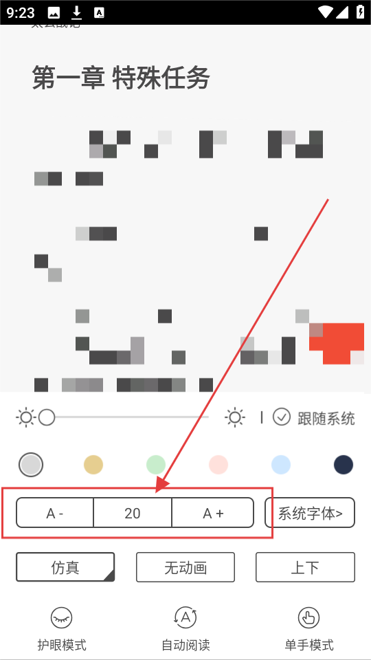 4、在设置选项中,可调整字号大小,如将字号调整为【20】,让阅读更舒适啦。