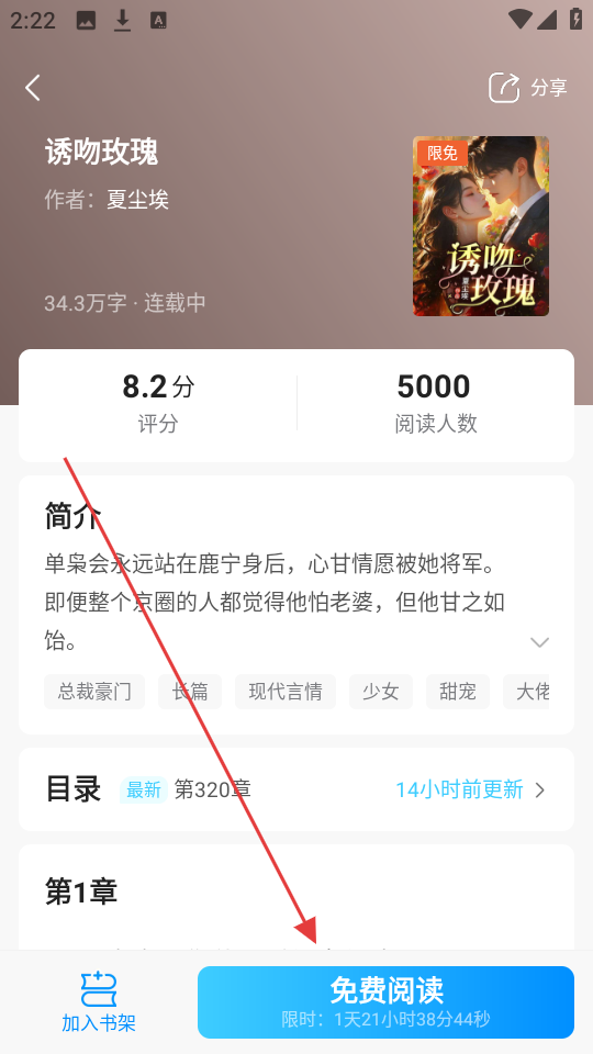 3、进入限免书籍详情页后,点击【免费阅读】,可进入阅读页面,开始阅读书籍内容啦。